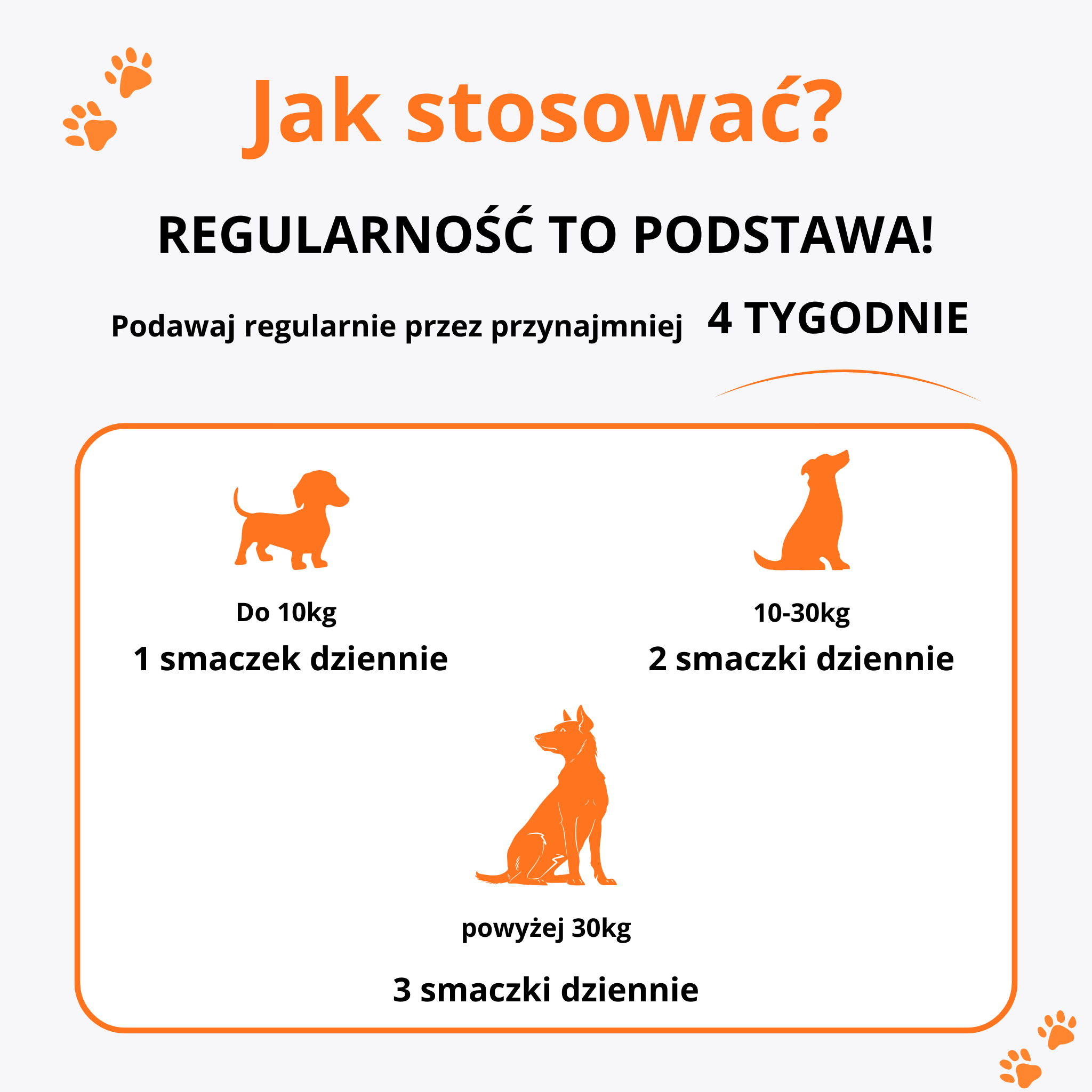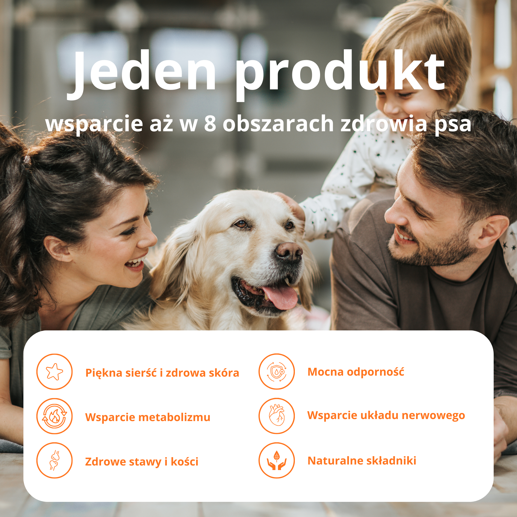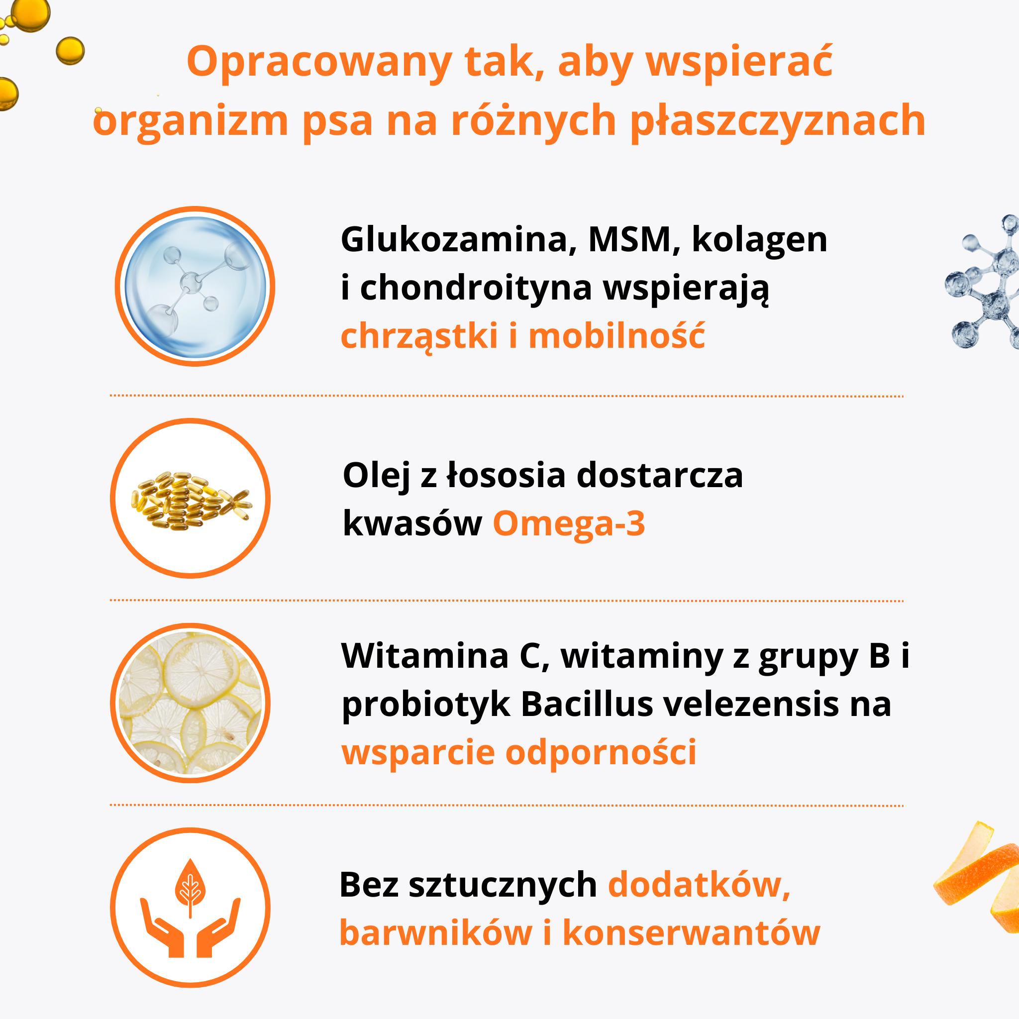 To kompleksowy suplement w formie smaczków – jeden produkt, wiele korzyści. Opracowany tak, aby wspierał organizm psa na różnych płaszczyznach: